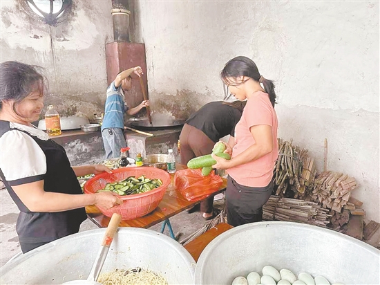 台山市冲蒌镇西坑村姑且安设点里,村干部带着意愿者正在厨房里忙前忙后,村平易近也自觉帮手做饭,让群众不正在家也能吃上暖心热饭。冲蒌镇供图。