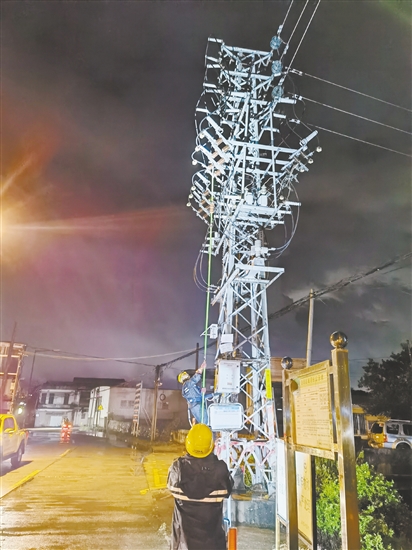 昨晚,江门新会供电局抢修步队对110kV七堡坐10千伏墟镇线开展停电操做,为后续抢好预备。 李乐恩 摄?。