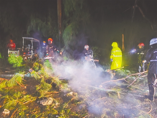 昨日,蓬江区中弘远厦附近,部分抢险步队操纵油锯朋分被风吹断的树枝,快速消弭平安现患。 郭永乐 摄。
